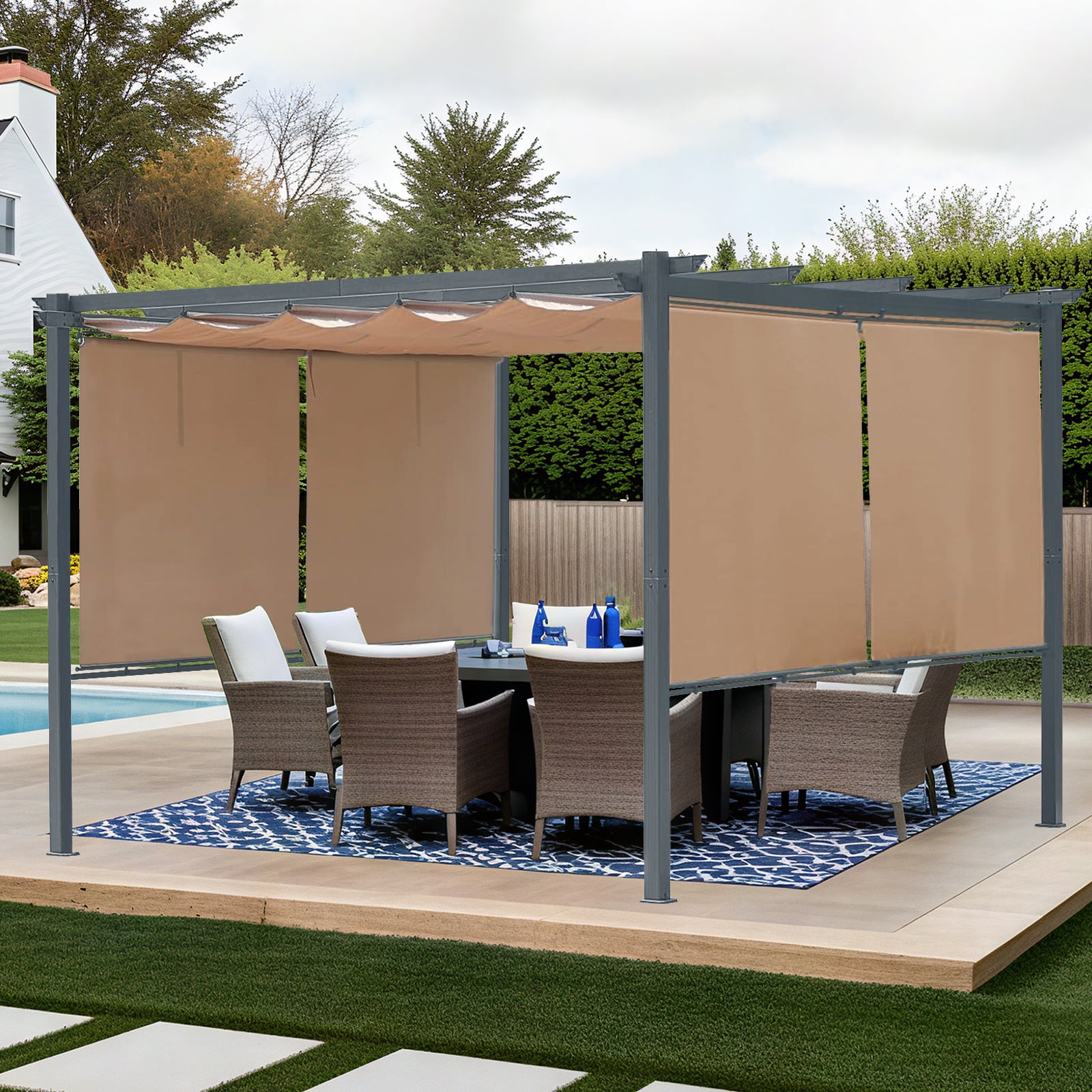 - Durable Fabric - Our pergola canopy and rolling curtains are crafted from premium polyester fiberthat is UV and fade resistant. Coated with PA for waterproof performance, ensuring long-lasting durability.