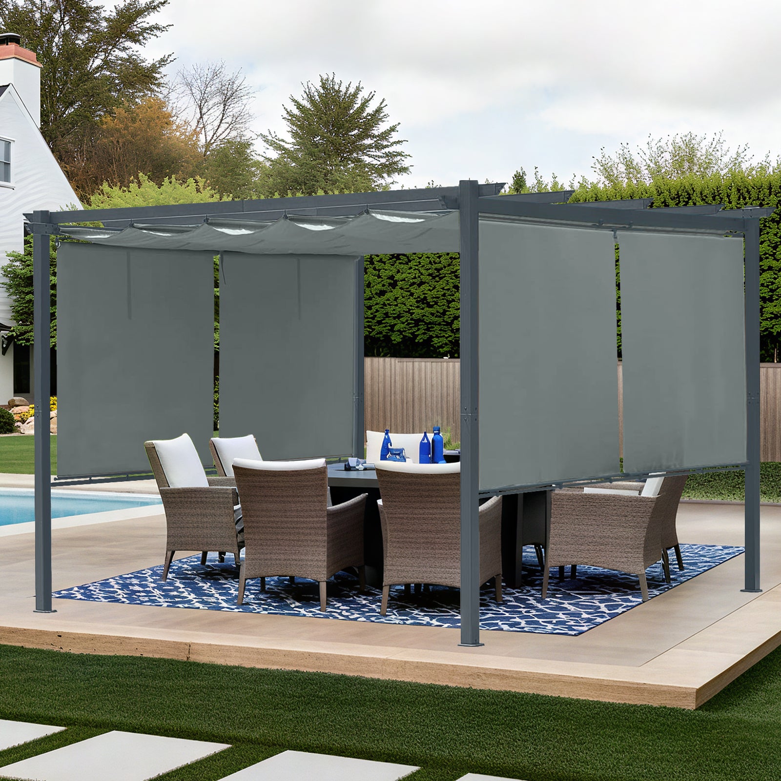 - Practical Accessories - Featuring 4 pieces rolling curtains for versatile sunlight control on one or both sides. Equipped with 8 expansion screws, fortifying the pergola's four base pillars against extreme weather.