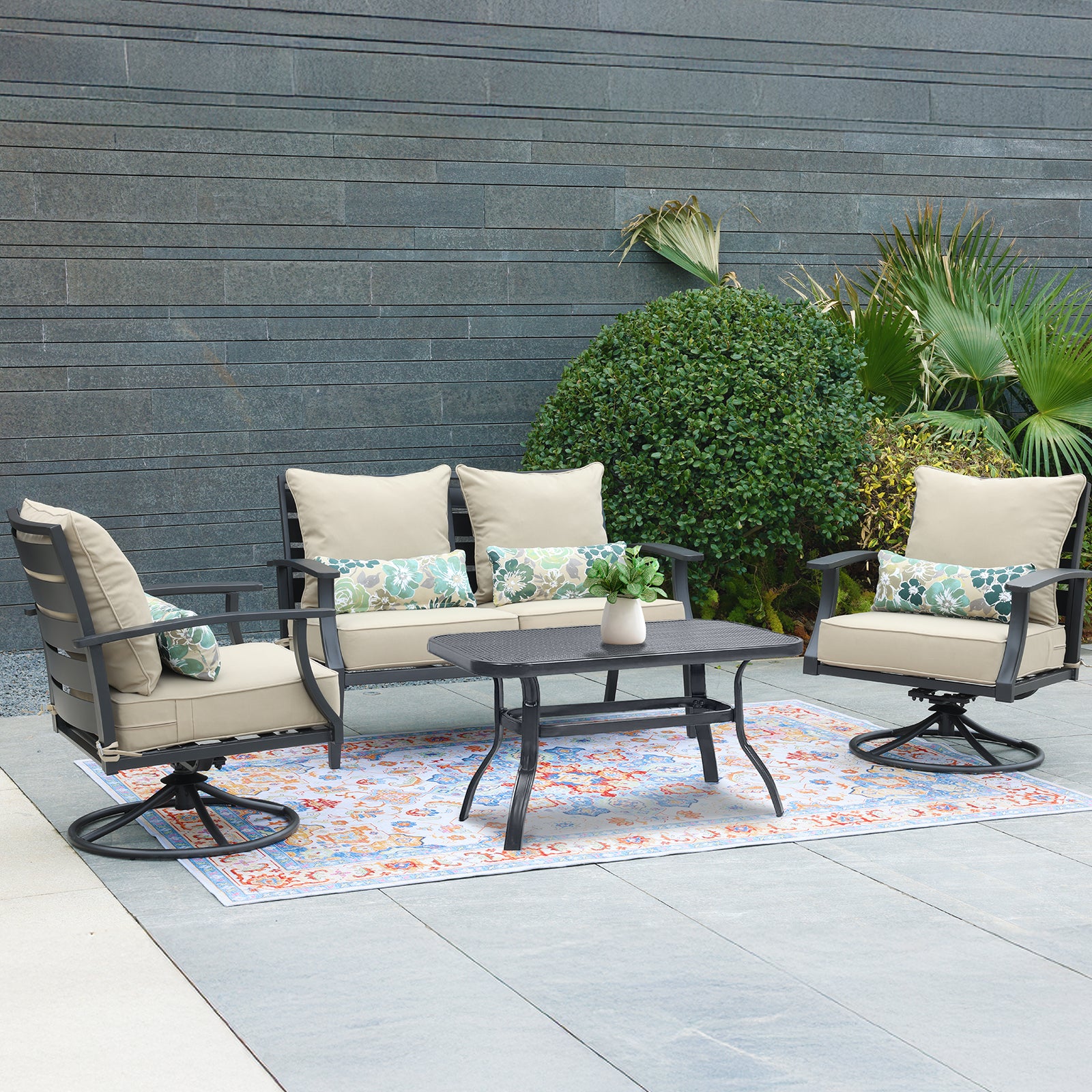 - The cushions are filled with 5.1” thick sponge foam, offering a soft yet supportive seating experience. The foam retains its shape and comfort over time, even with prolonged use.