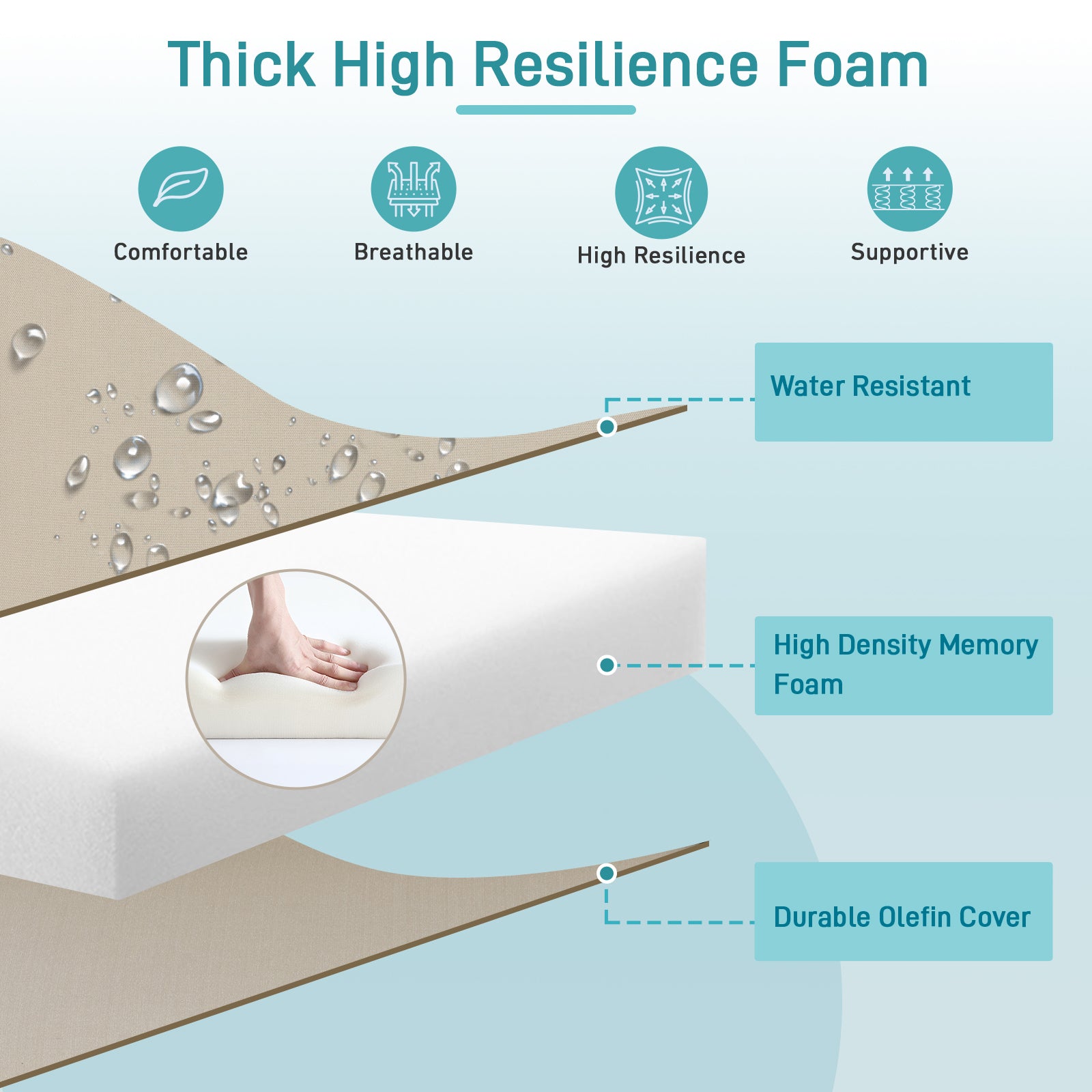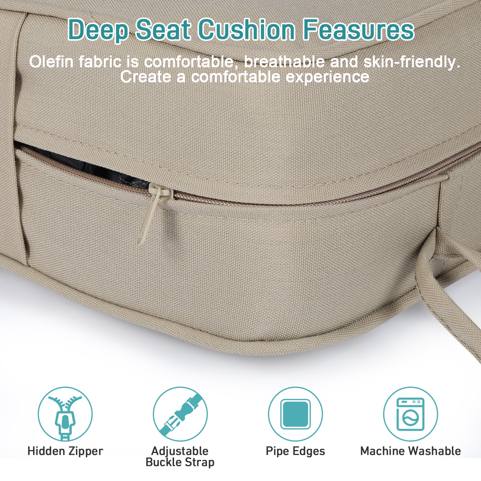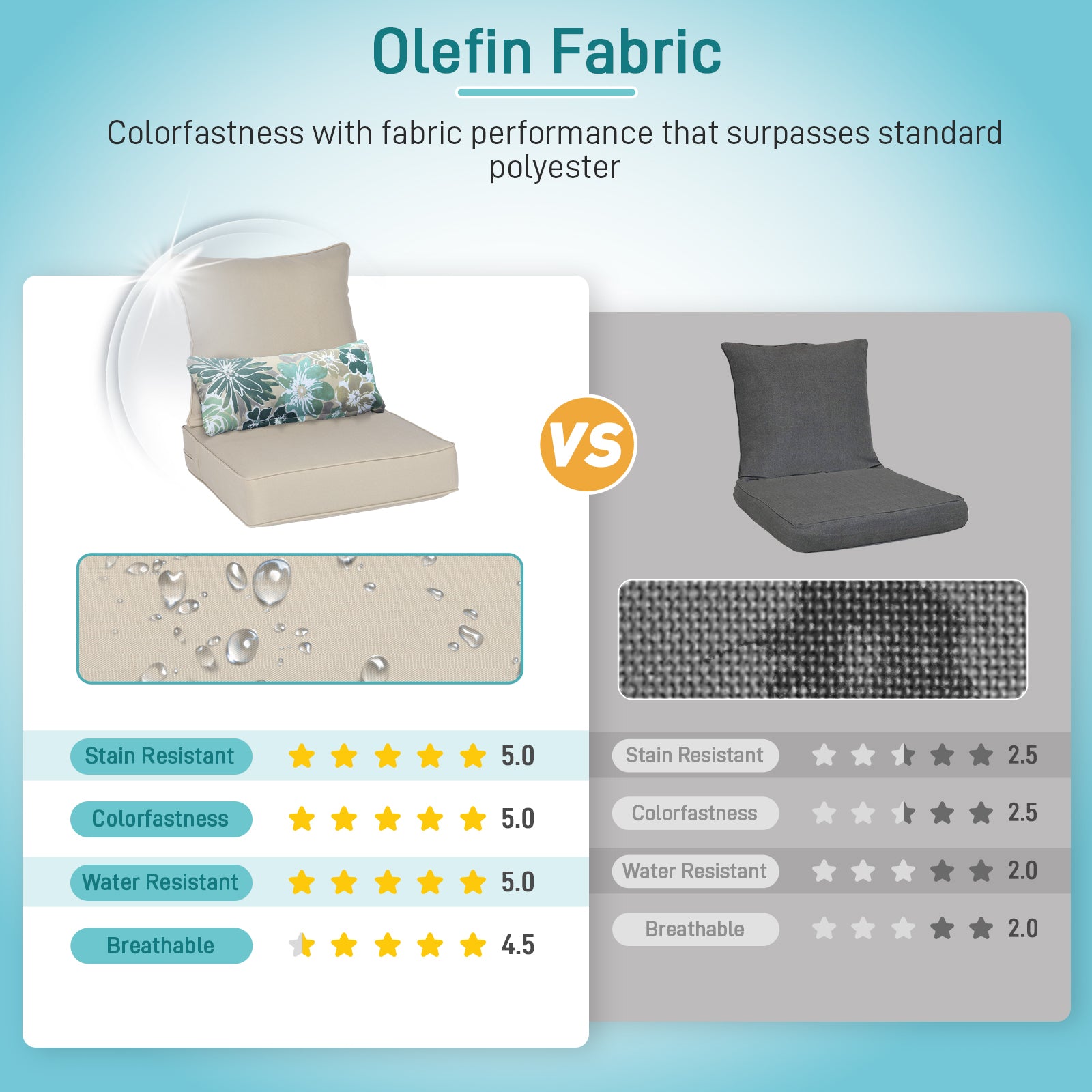 - The cushion covers are made of stain-resistant and mildew-resistant olefin fabric, which is fade-resistant, UV-protected, and water-resistant and durable.