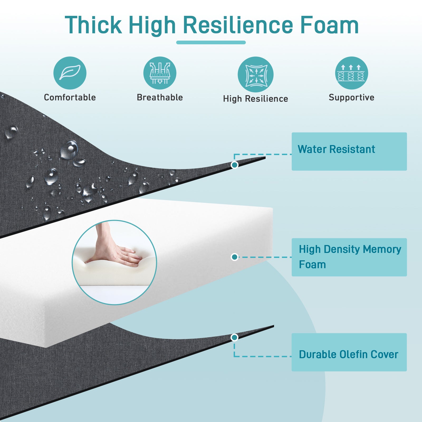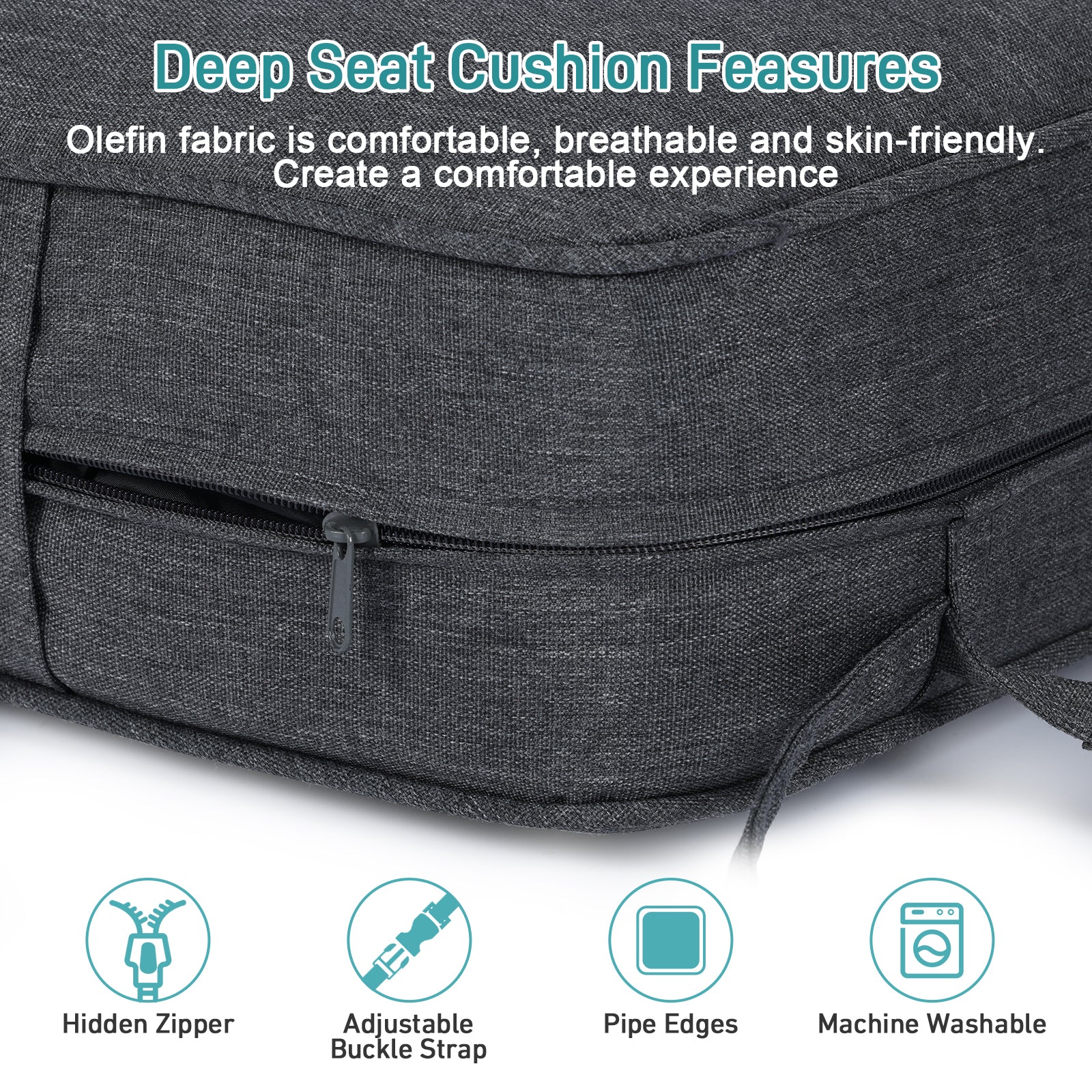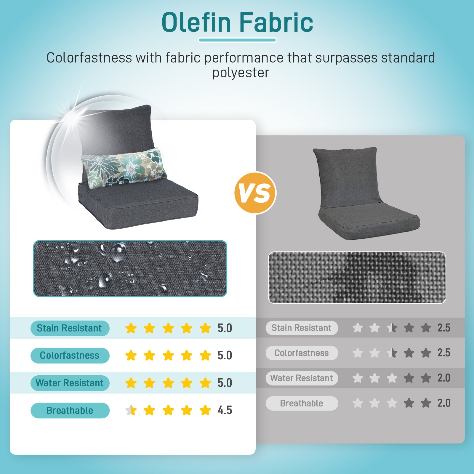 - The cushion covers are made of stain-resistant and mildew-resistant olefin fabric, which is fade-resistant, UV-protected, and water-resistant and durable.