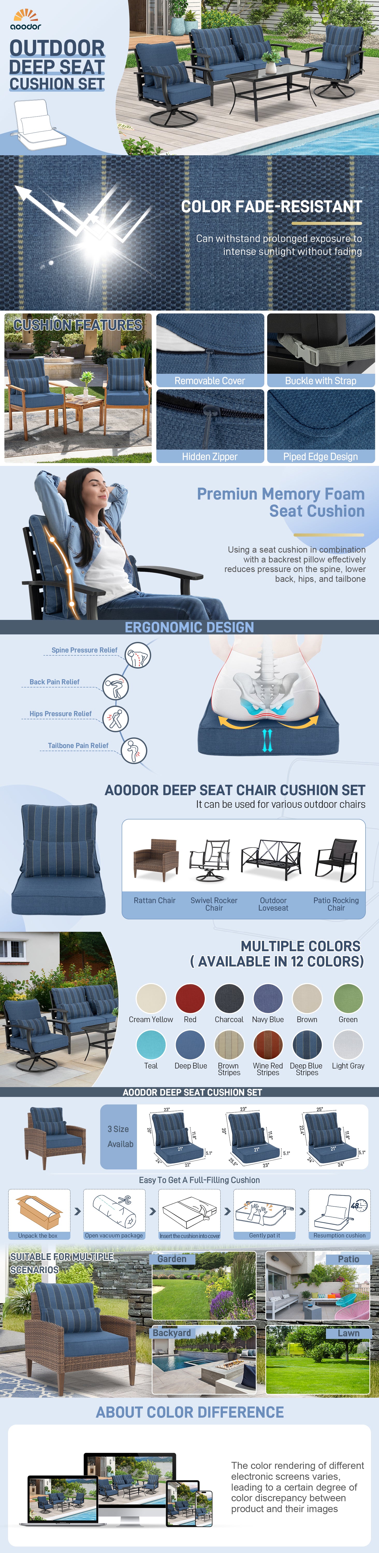 - Yes, these cushions are available in a variety of colors including Brown, Red, Blue, Green, etc. to match different outdoor furniture styles. All colors use fade-resistant olefin fabric to maintain vibrancy over time.