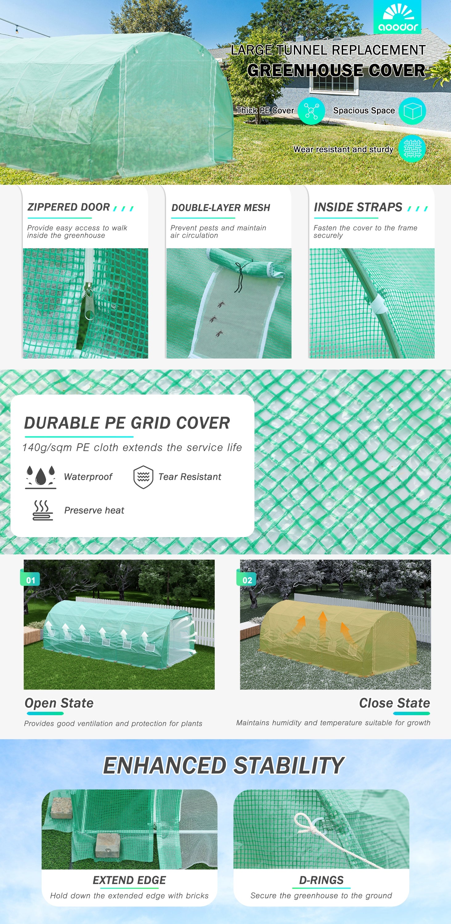 - Secure Windproof Structure: Internal straps, D-ring anchors, ground stakes, and weighted edges work together to tightly secure the greenhouse to its frame and foundation, ensuring stability in windy conditions