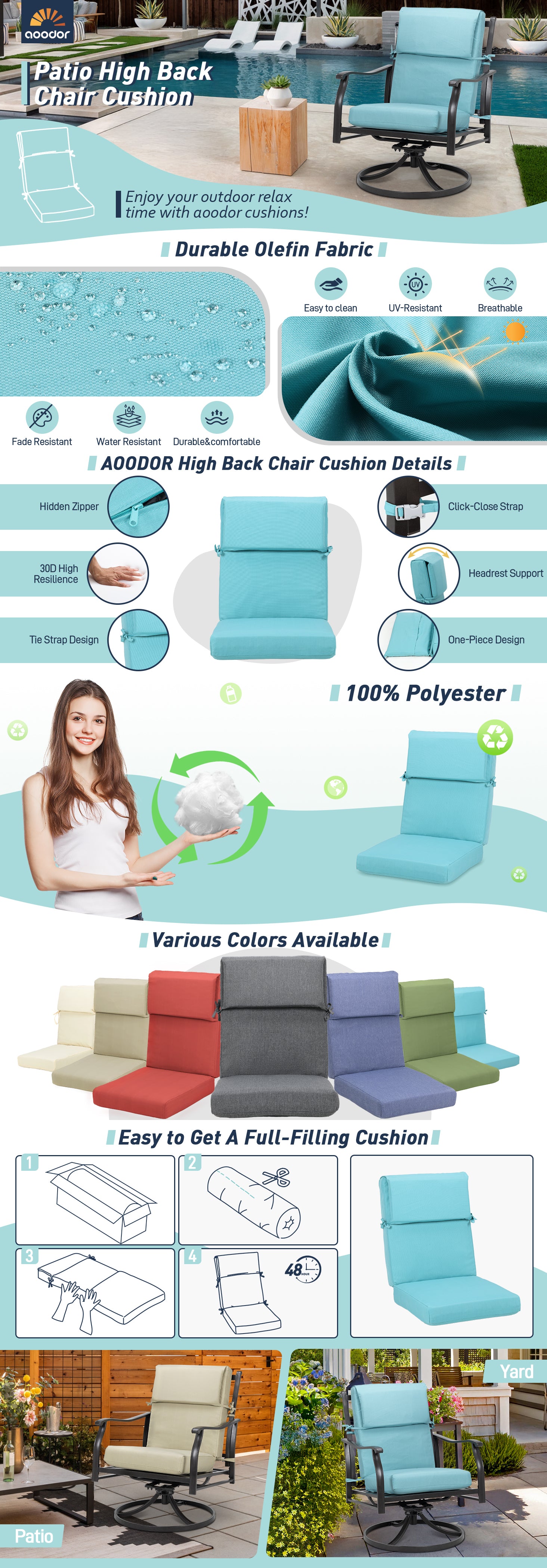 The cushions feature a Olefin fabric cover for durability and weather resistance, with soft and flexible sponge foam filling for comfort. The cover includes sewn seam closures and dual-lock nylon straps to keep the cushion securely attached to high-back chairs.